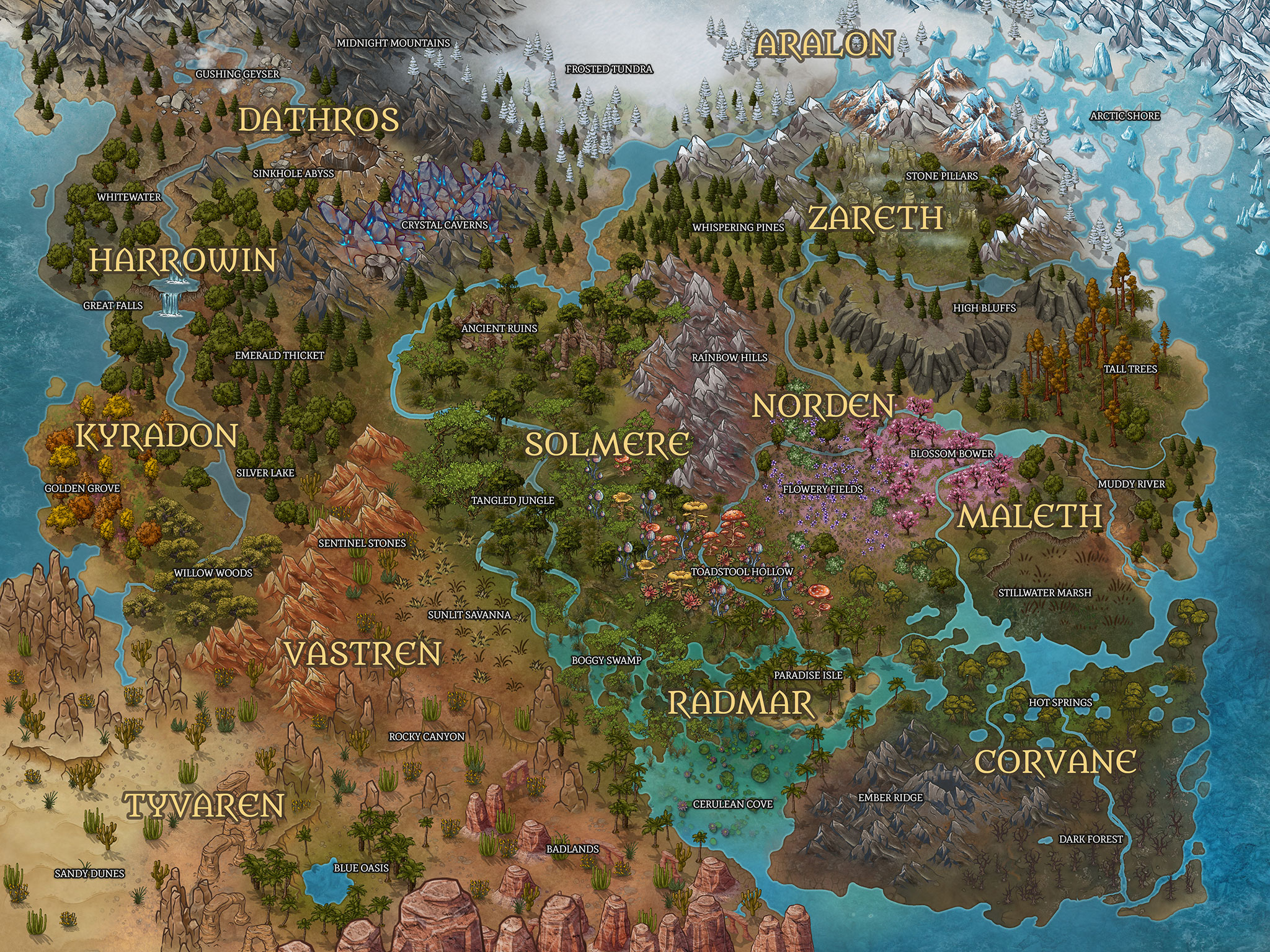 Characters are limited to affecting an area within line-of-sight or shouting distance. Characters can not create permanent drastic changes to the landscape that would require a change to the official description of the area (ie building a massive castle or a wall around an entire territory) but they can make small structures, such as building a hut to use as a den, tilling a small farm plot or garden, planting a flowerbed, etc. FLORA AND FAUNA All manner of living, extinct, realistic, or fantasy / mythological creatures exist in the environment. Animals native to a specific biome will be more common in an area with a matching biome (ie polar bears in an arctic region or antelope in a savanna); however any animal may be found in any territory. Plants may be realistic or fantasy in nature and may grow at unusual sizes.
